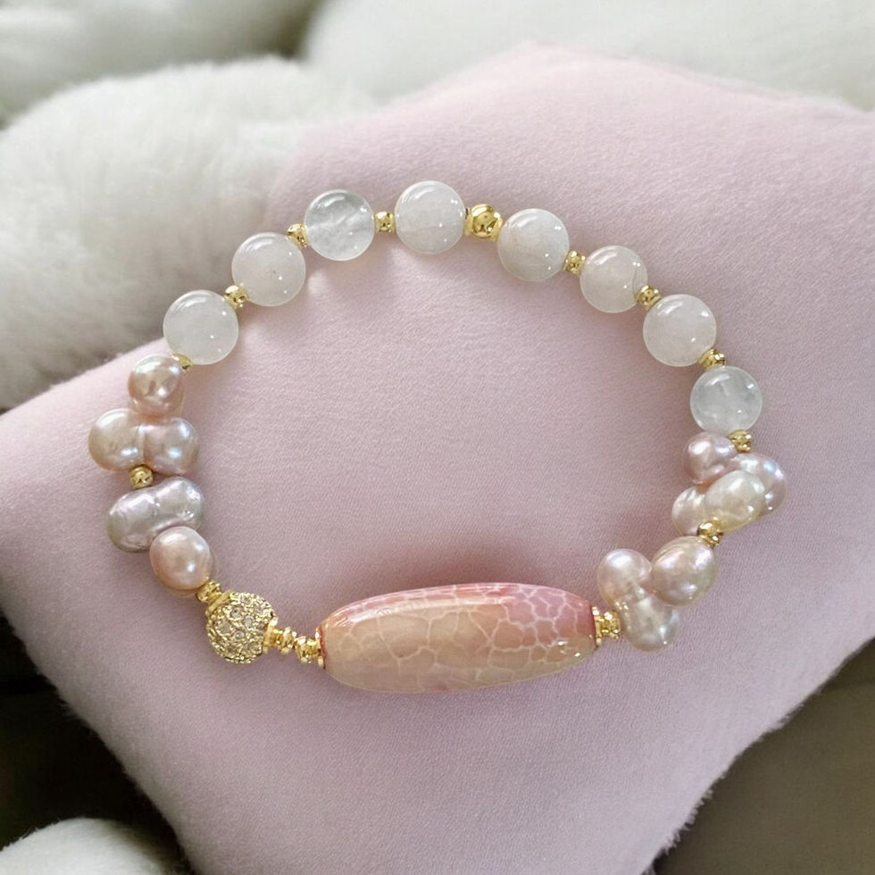 - Cuentas redondas de piedra translúcida en tonos blancos suaves